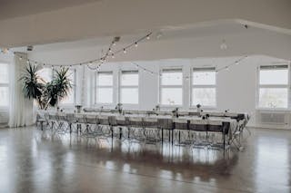 Colonia Nova offers a classy event loft, located in a former cash register factory building, provides all you need to make your event a major success. The loft includes a 30 sqm custom-made bar area, made from the finest materials such as copper and solid wood and is tastefully illuminated by handmade oak lamps. The floor is made of a freshly cast high quality screed. The light system consists of 80 meters of ERCO rails with up to 30 dimmable lights and spot-lights for various atmospheres and the surround sound system is completely adjusted to the loft. The large windows guarantee bright daylight throughout the day and designer furniture and palm trees provide the room with a luxurious touch.